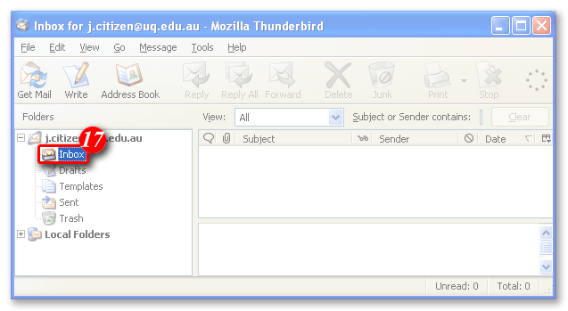 | 19)Click the [OK] button to continue. Thunderbird will download any new messages from your mail account. (All new mail will be displayed in the right pane). |